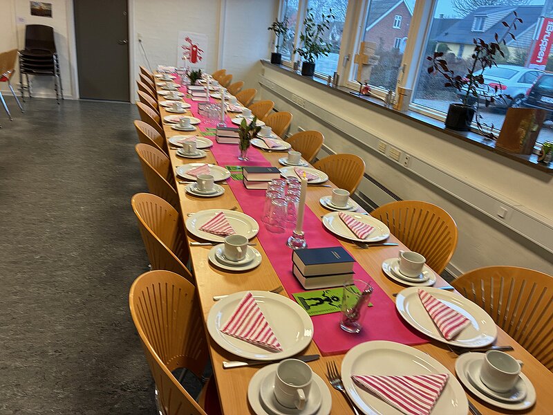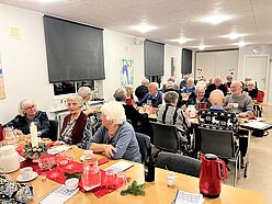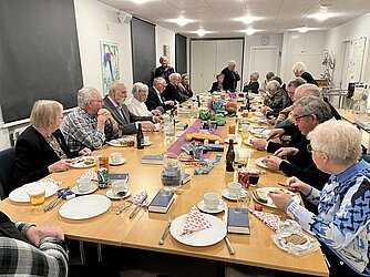Efter gudstjenesten gik vi i Sognehuset og spiste vores medbragte mad. For første gang havde vi arrangementet sammen med Grenå Y's Men's Club. Vi sang nogle sange fra Højskolesangbogen og derefter snakkede nogle videre, andre var på Kirkegården og et 3. hold gik en lille tur i det friske vejr.